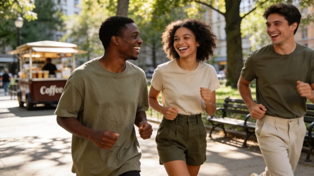 Group of people wearing breathable Lyocell casual clothing walking in a sunny urban park